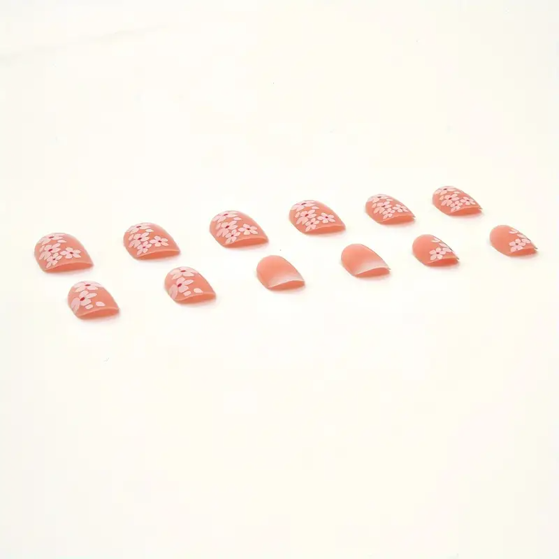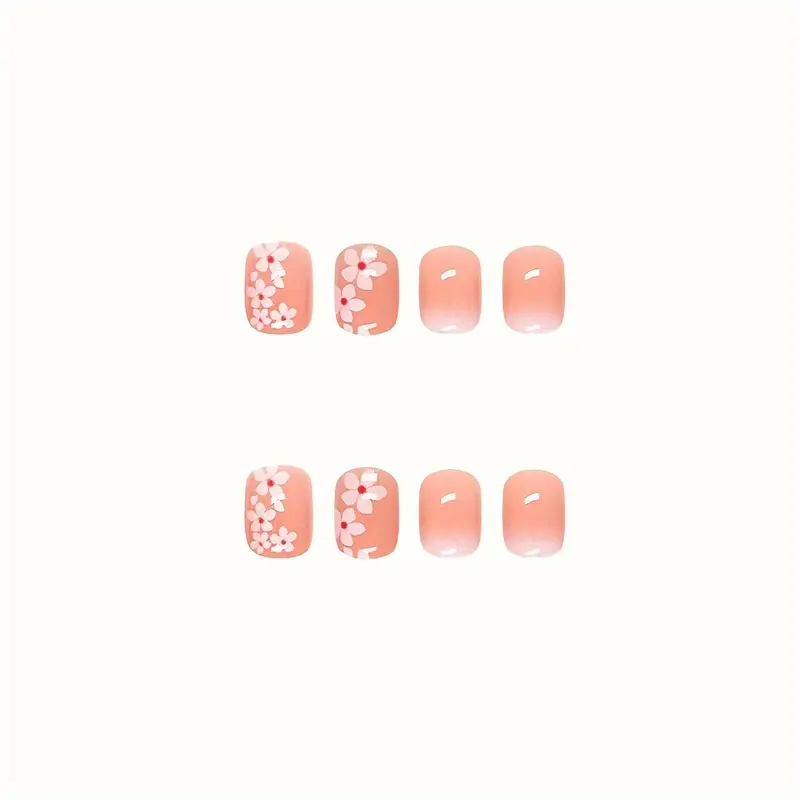 Romantic cherry blossom design on short square nails with a glossy finish. Comes with jelly glue and a nail file, perfect for effortless, feminine looks.