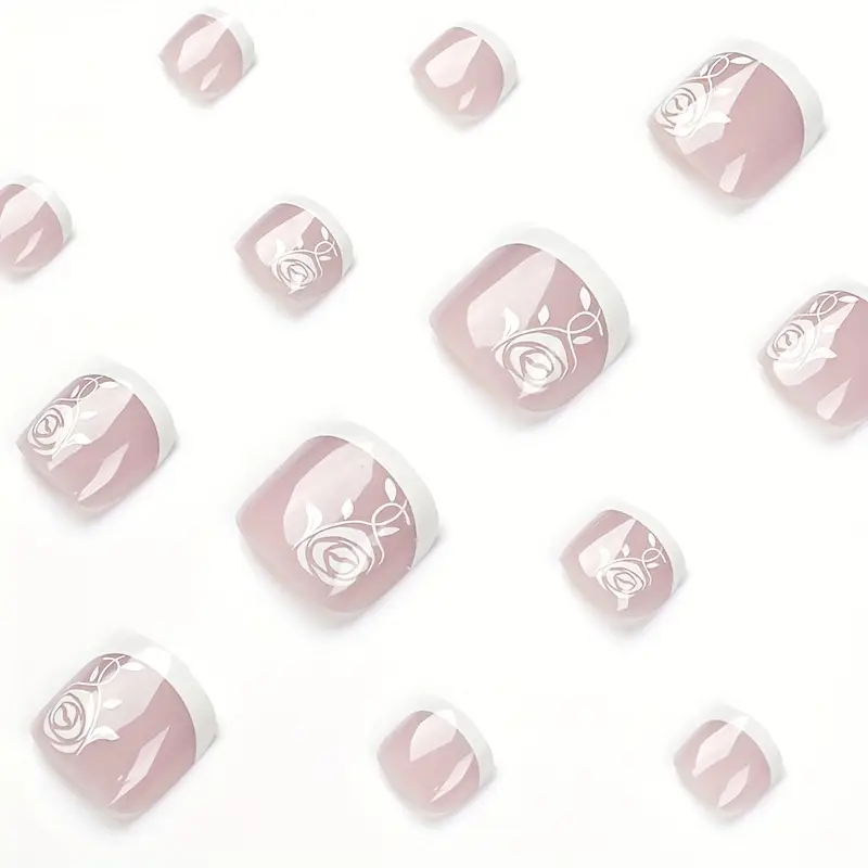 Short square toenails featuring a delicate white edge and soft pink rose accents. Includes jelly glue and nail file for easy application — perfect for brides or special events.