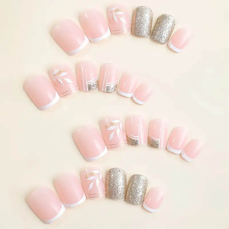 π Pastel pink with golden glitter press-on nails in short square shape. Shiny, stylish & effortless glam!